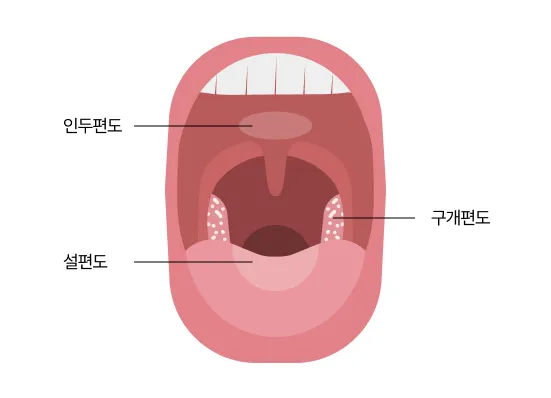 목의 안쪽과 코의 뒷부분에는 세균 등의 물질로부터 일차적으로 우리 몸을 방어하는 조직이 있는데 이중에 크기가 크고 대표적인 것이 편도입니다. 입을 벌렸을 때 혀 뒤쪽의 양측에 존재하는 두개의 덩어리가 흔히 말하는 편도(구개편도)이며, 이외에도 인두편도, 귀인두관편도, 혀편도 등이 있습니다.