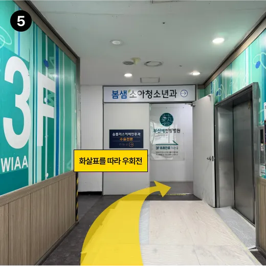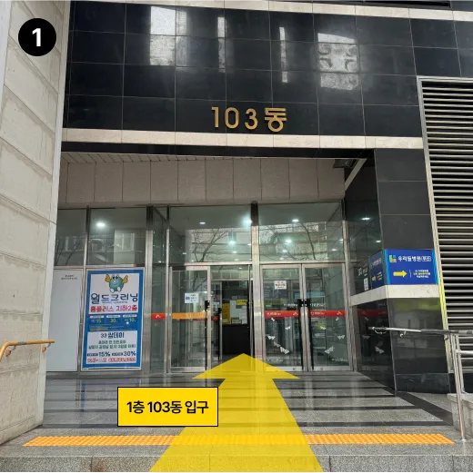 103동 입구에서 안으로 들어오시고 우측에 보이는 엘리베이터가 아닌 상가 엘리베이터를 이용해 3층으로 오시면 됩니다.