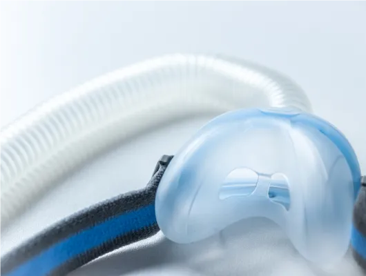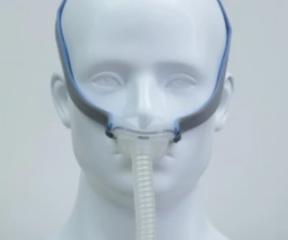 코로 직접 주입구를 연결하는 방식으로 자면서 뒤척이는 환자도 안정적으로 압력을 전달받으며, 마스크가 작아 피부에 닿는 면적이 좁습니다.
